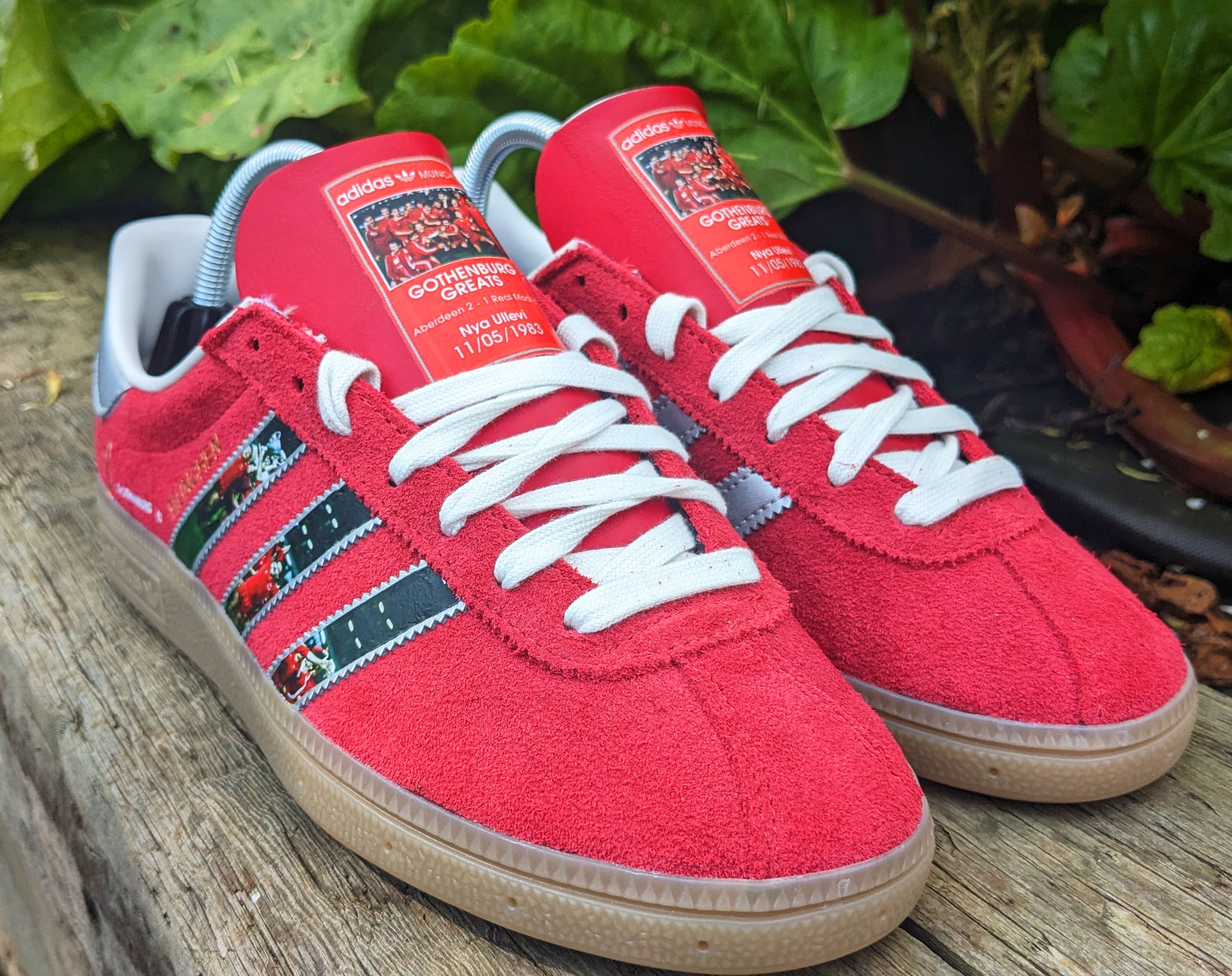 Limited edition Aberdeen FC European cup winners cup 83 (Gothenburg Greats) Red / Silver custom Adidas Munchen Trainers. Sizes 5 to 12.