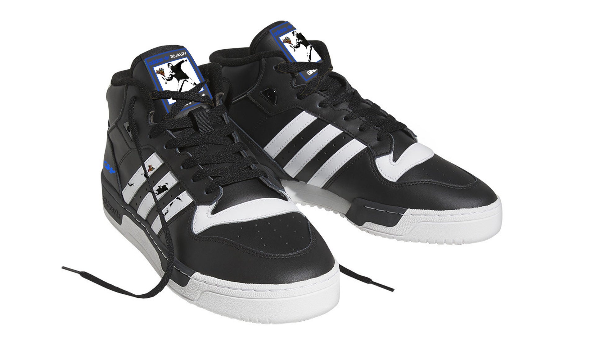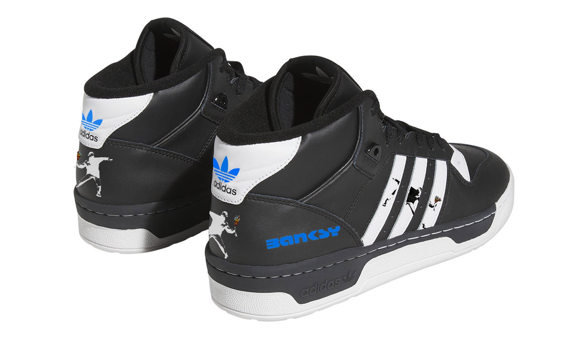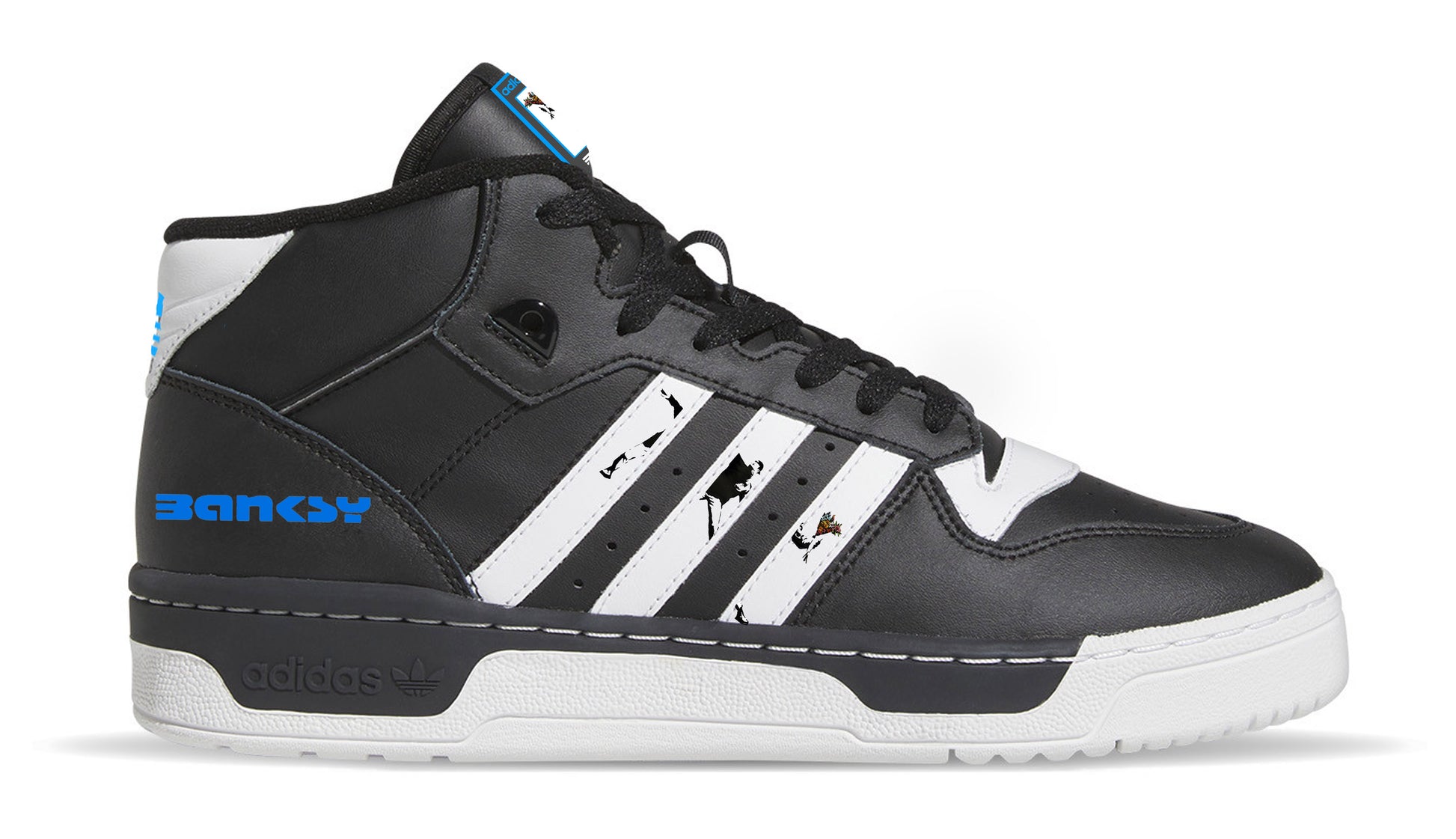 Limited edition Banksy Flower Thrower black/ white/ blue Adidas custom Rivalry Mid trainers / sneakers