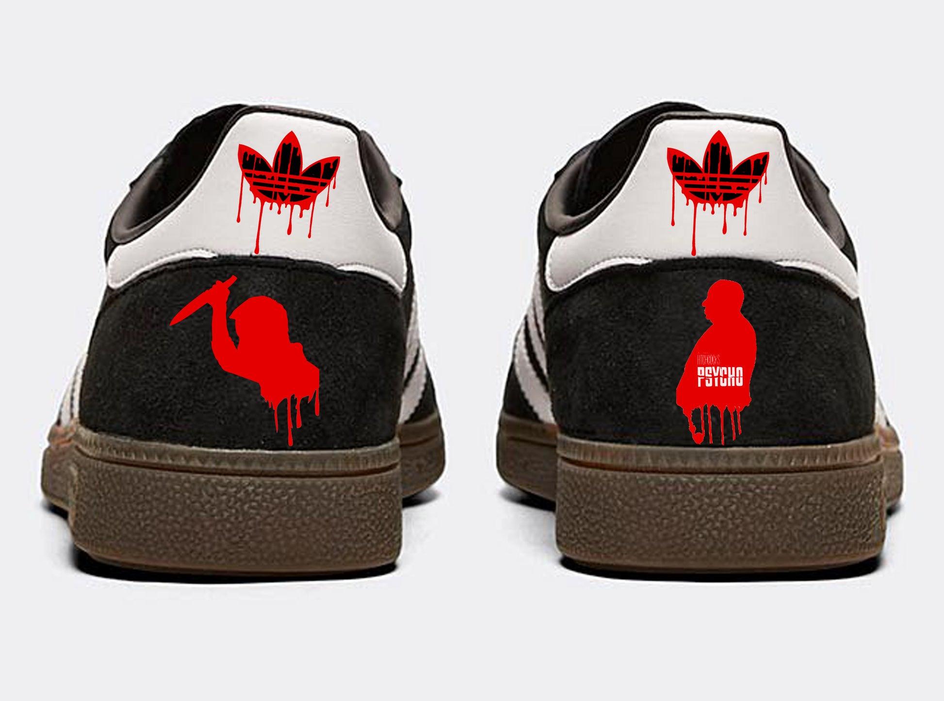 Heels feature Norman Bates and Alfred Hitchcock silhouette and blood dripping Adidas logo.