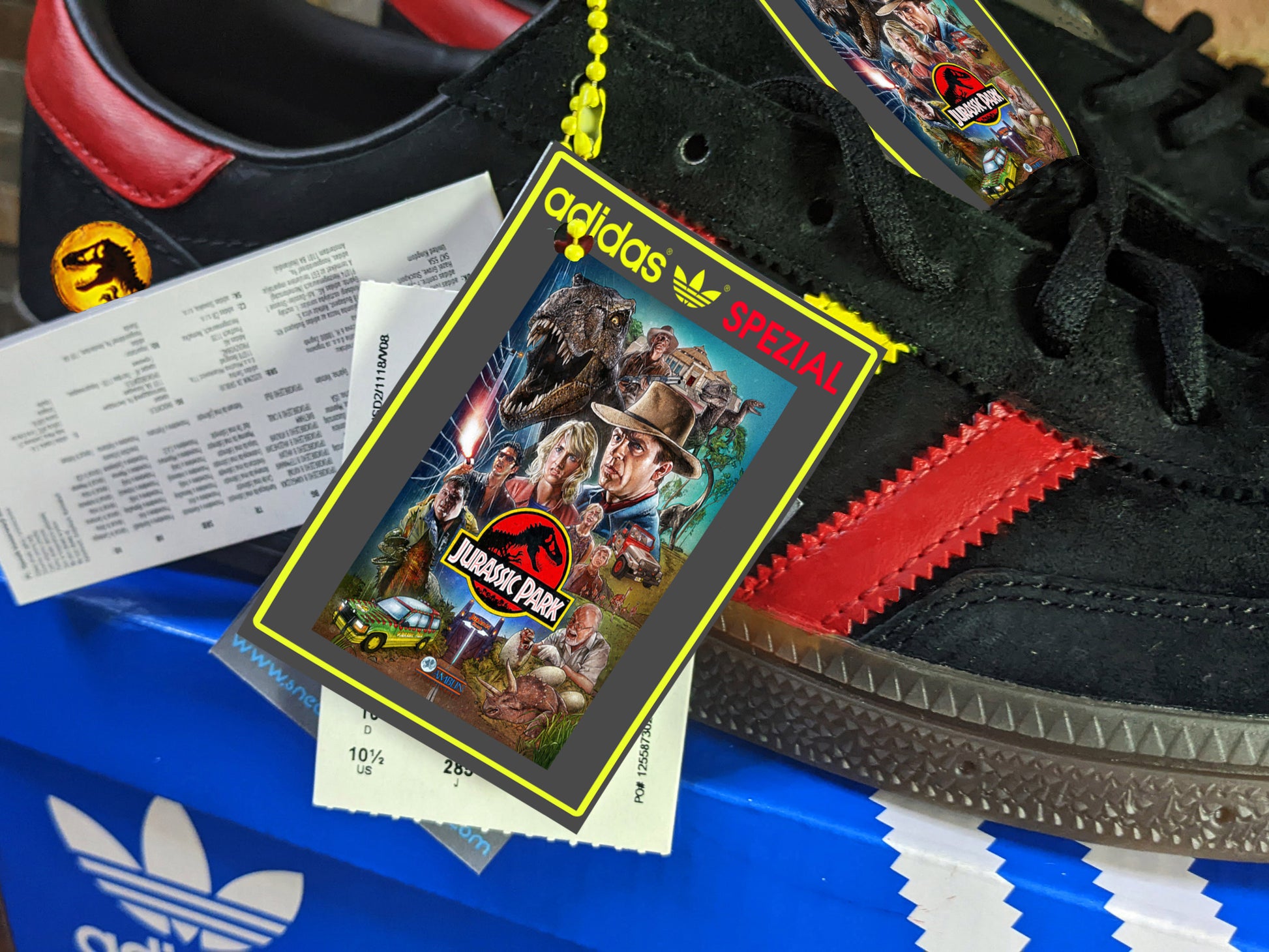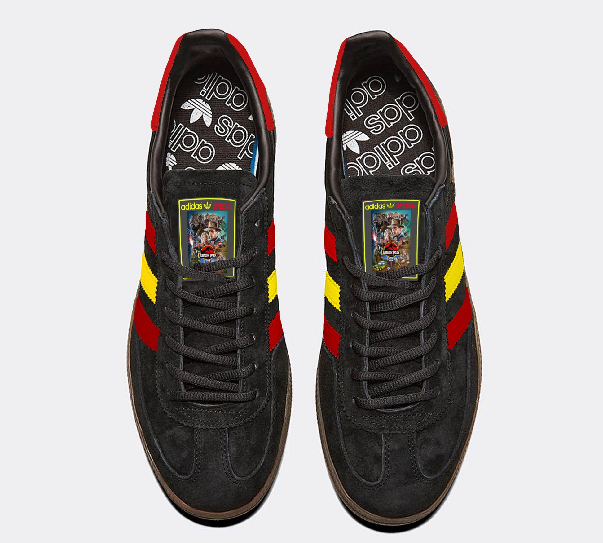 Limited edition Jurassic Park inspired black / red / yellow Adidas custom Handball Spezial trainers / sneakers.