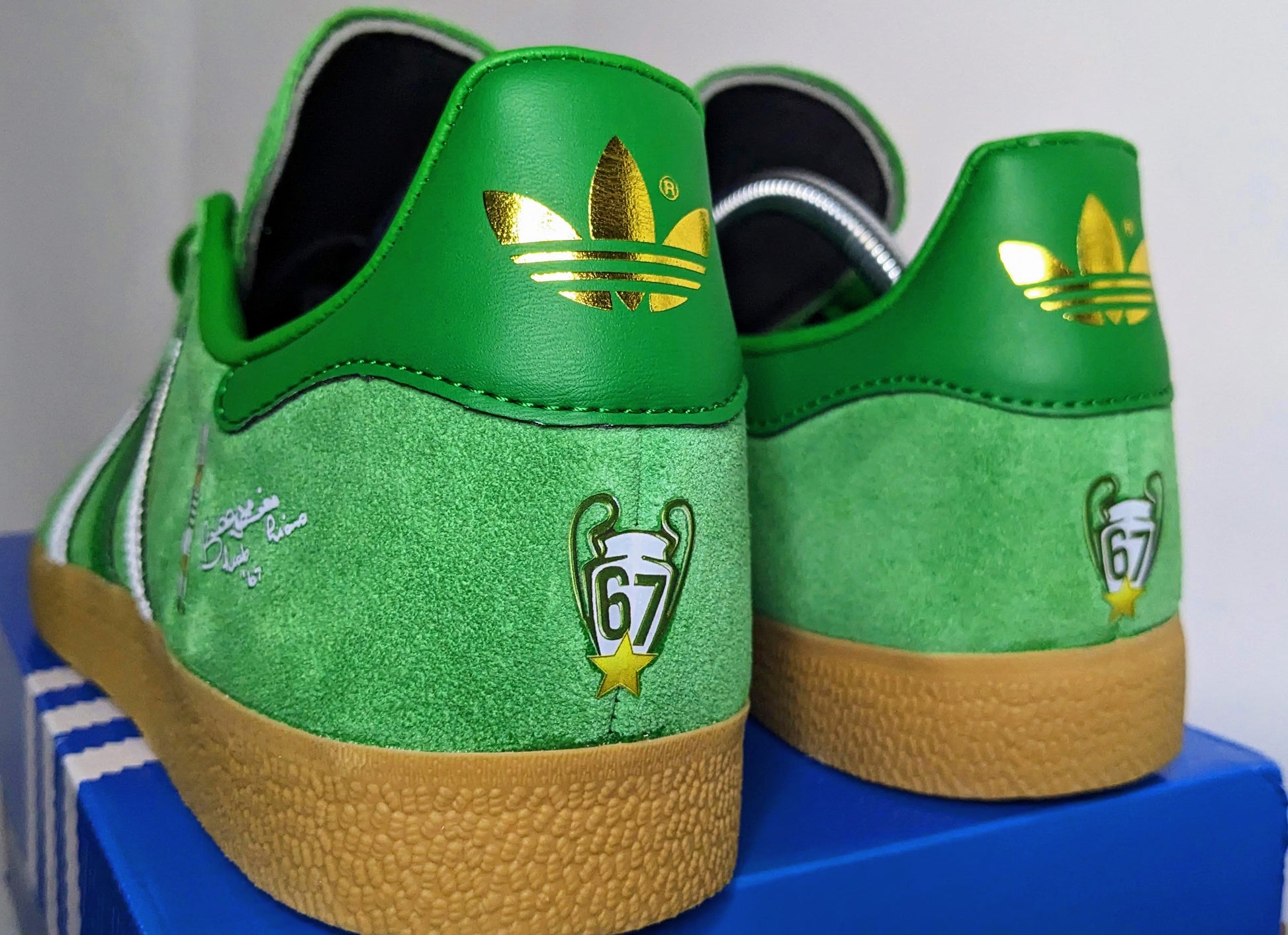 Limited edition Celtics FC European champions 67 green / white Adidas custom Gazelle trainers.