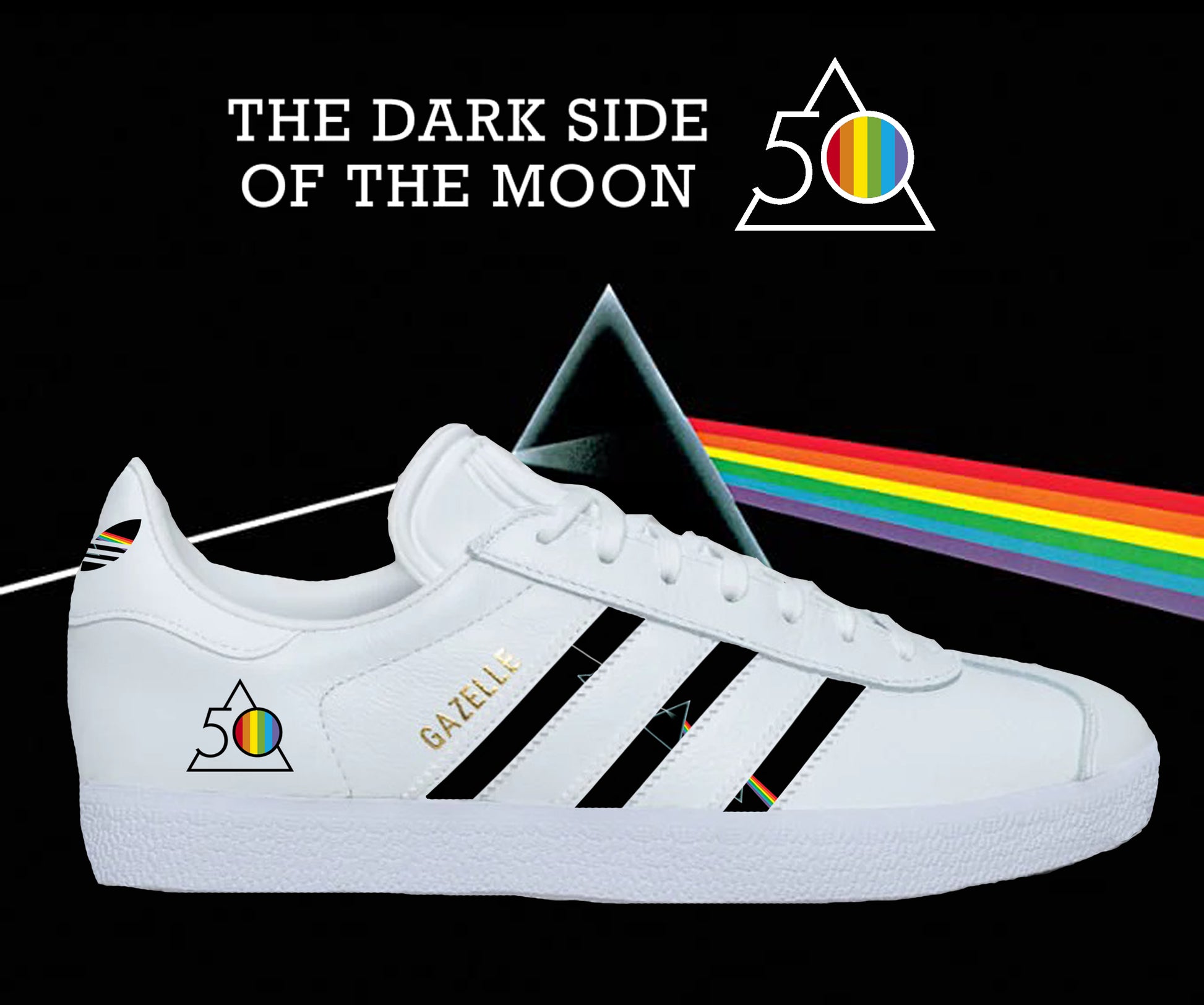 Limited edition Pink Floyd The Dark side of the moon 50th anniversary custom adidas originals white Gazelle trainers / sneakers.