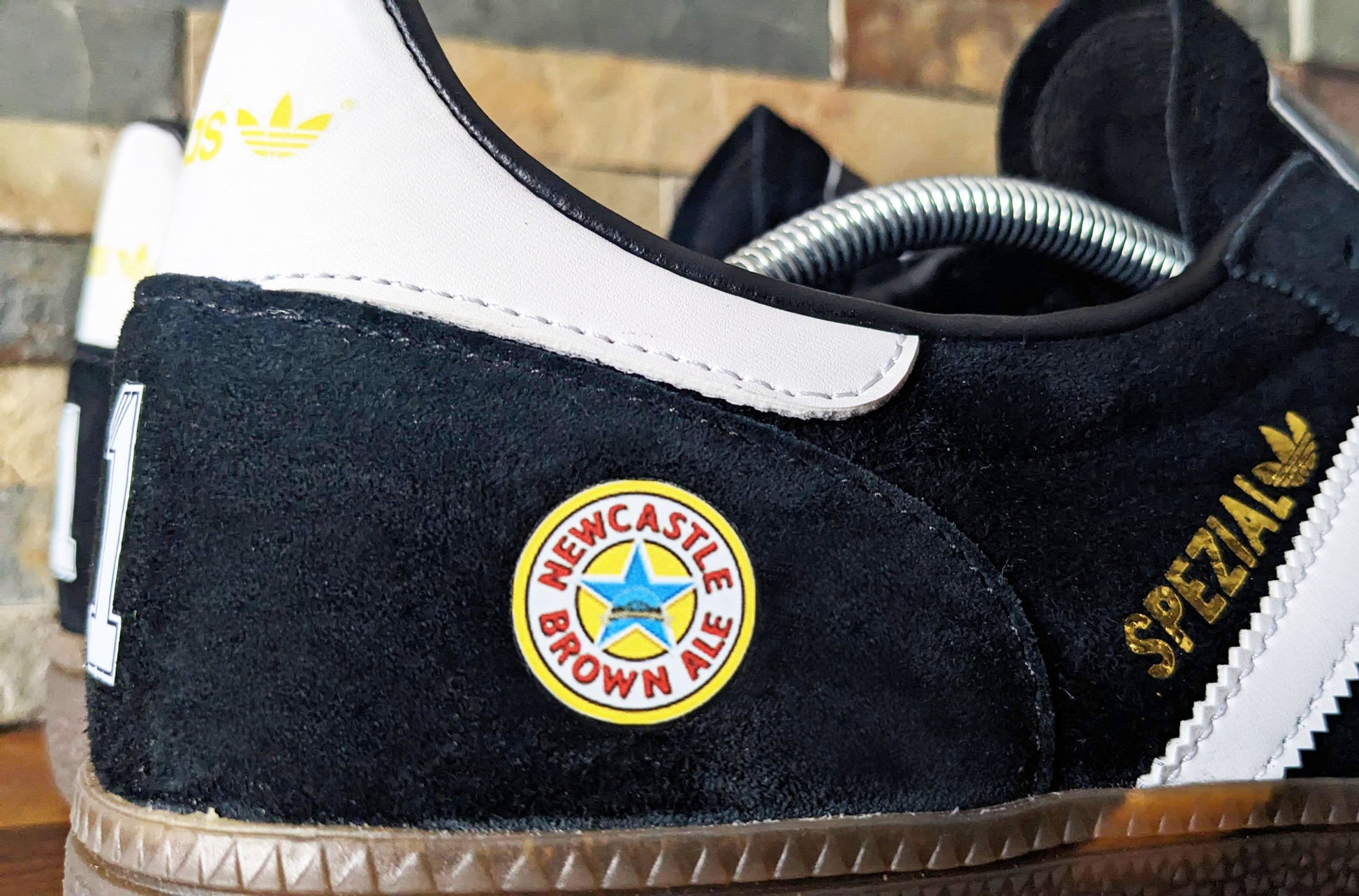 Tongue design features Asprilia goal celebration and printed signature. Heel design features player number in retro PL shirt font. Rear sides feature retro Newcastle Brown Ale logo.