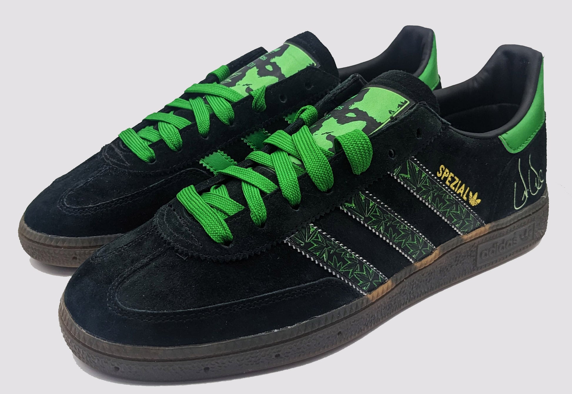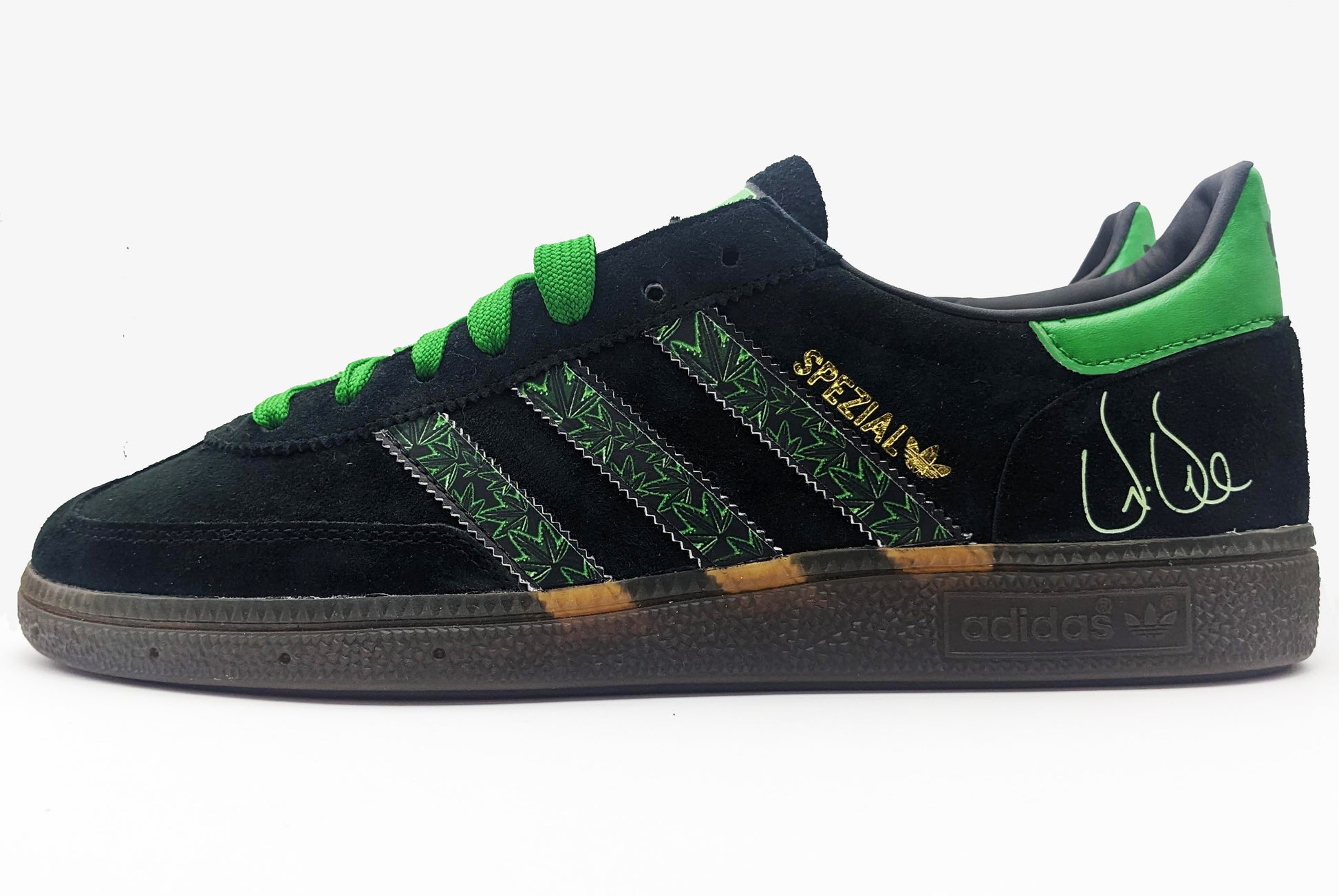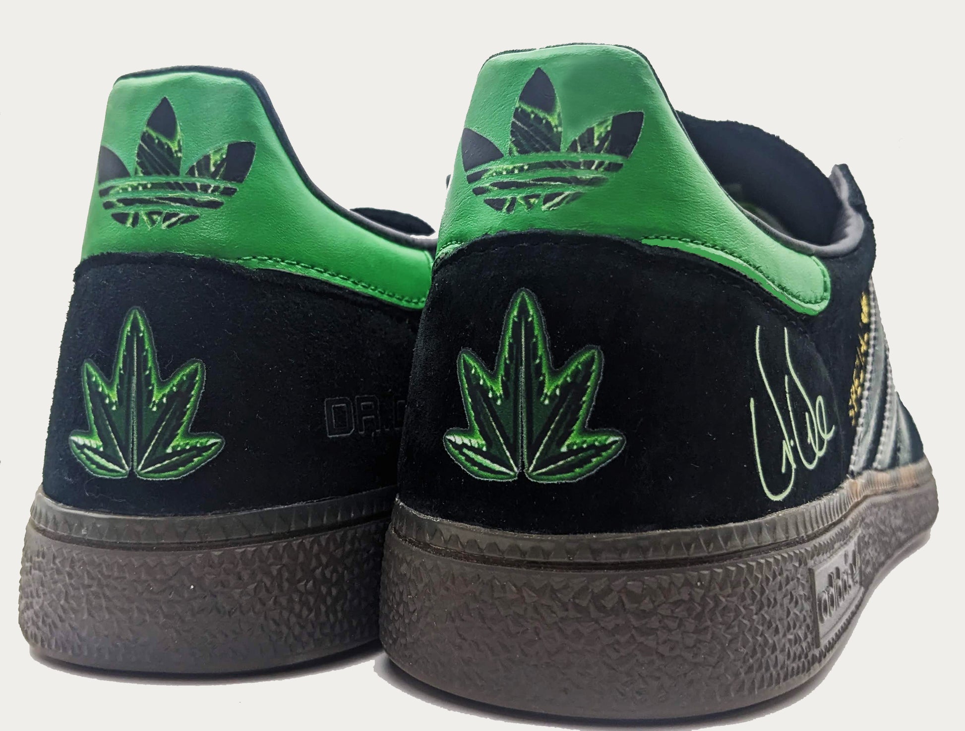 Limited edition Dr Dre Chronic 2001 black / green Adidas custom Handball Spezial trainers / sneakers.