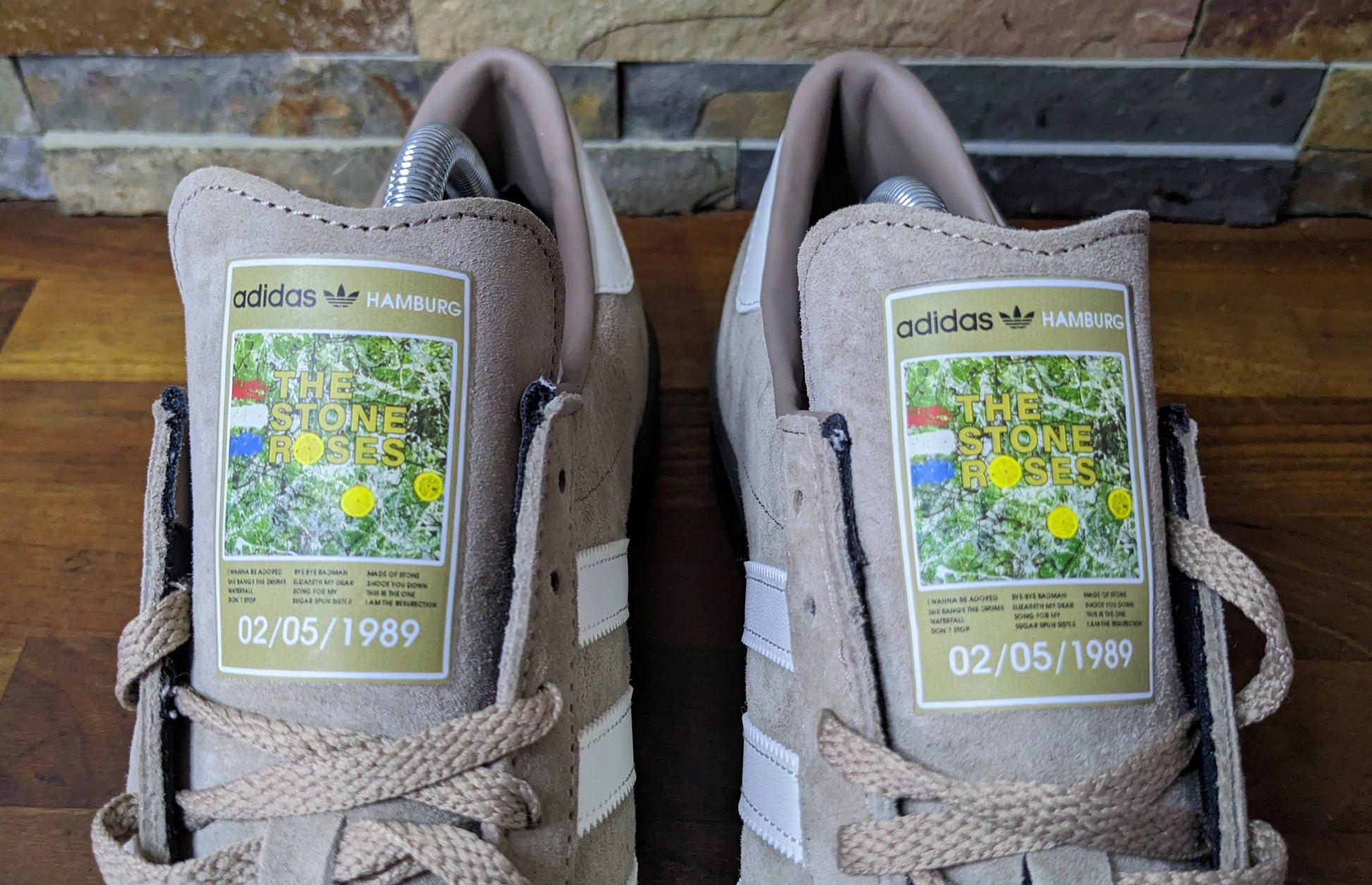 Limited edition The Stone Roses album chalky brown / white suede Adidas custom Hamburg trainers / sneakers