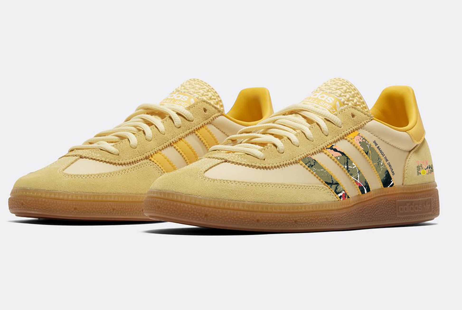Limited edition The Stone Roses She bangs the drums custom adidas originals yellow Handball Spezial trainers / sneakers.