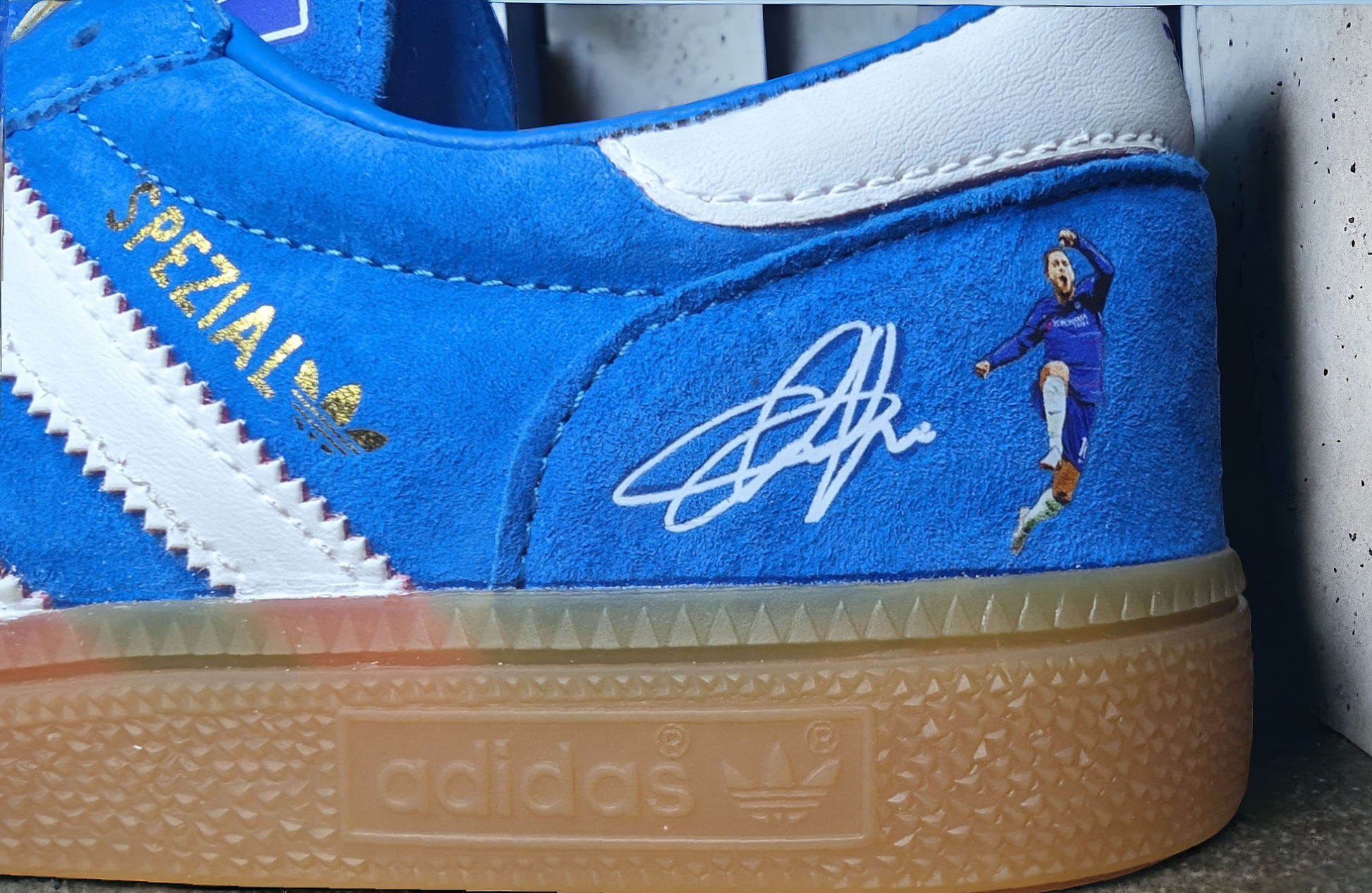 Limited edition Chelsea FC Eden Hazard inspired blue /white/ suede Adidas custom Handball Spezial trainers / sneakers