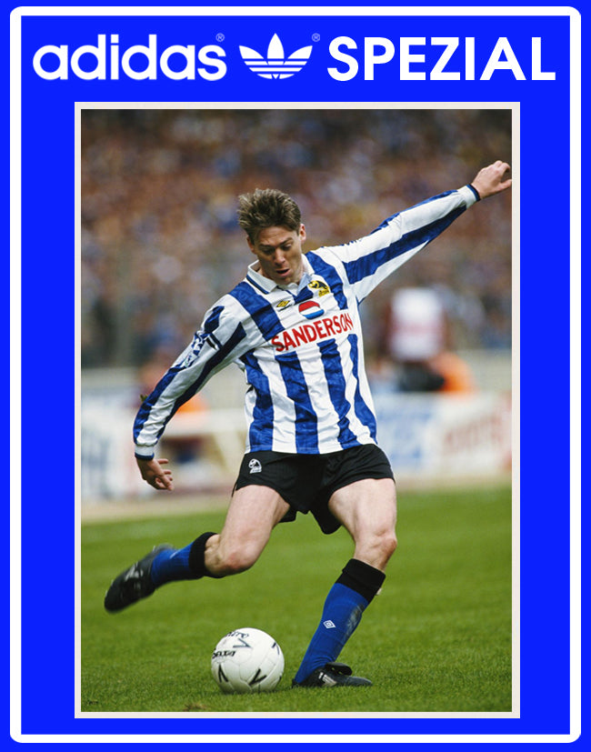 Limited edition Sheffield Wednesday Chris Waddle inspired blue /white/ suede Adidas custom Handball Spezial trainers / sneakers